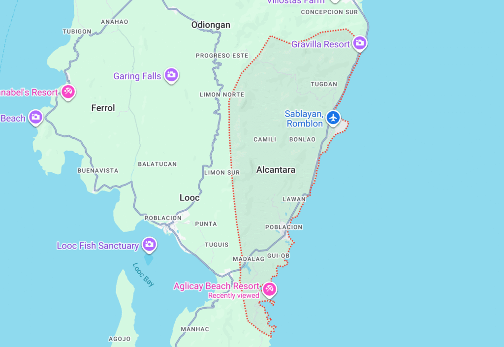 Alcantara is a municipality of Romblon Province that lies on the southeastern seaboard of Tablas Island facing the Sibuyan Sea. It is bounded on the North by Sta. Maria, on the Northwest by Odiongan, on the East by Romblon Pass, on the South by Sta. Fe, and on the West by Looc; 12º22’ N to 12º12’22” S latitude and 122º6’ E to 122º2’ W longitude.